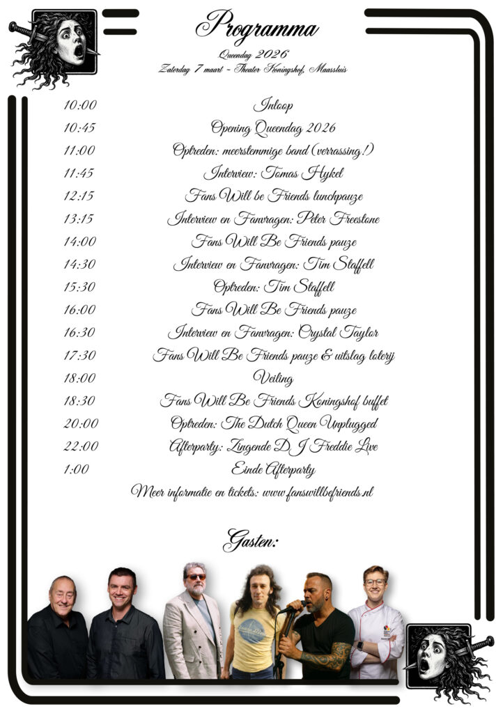 Fans uit Nederland en andere Europese landen komen samen om naar de muziek en verhalen over Freddie, Brian, John en Roger te luisteren. Te gast zijn (Smile) zanger en muzikant Tim Staffell, die ook zal optreden, Tom Hykel (World of Freddie / Freddie The Exhibition), Peter Freestone (p.a. Freddie Mercury) en Crystal Taylor (roadie & p.a. Roger Taylor). Uiteraard kun je ze zelf ook vragen stellen en wellicht zelfs met ze op de foto gaan. Ook zal meester bakker Maxine Glutsch aanwezig zijn met speciaal Queen-brood en koekjes en verzorgt DJ Freddie-Live een afterparty met karaoke en zingen. En er is een afsluitend volledig concert van de band The Dutch Queen Unplugged!